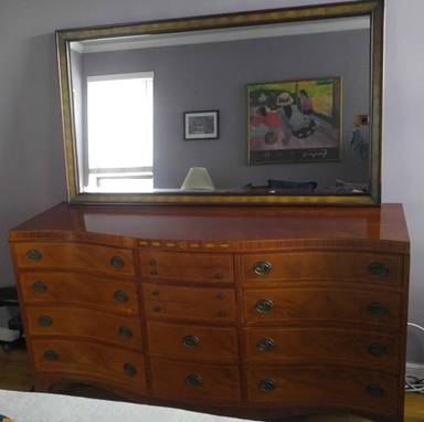 For sale: Gorgeous mahogany dresser (c. 1948) w inlay & large mirror. I have knob for ctr. top drawer. 66"L x 25"D x 36"H. Mirror w leather frame is 60"L x 34"H. Really good condition, wood beautiful glow in daylight. Make an offer, Pkup only in Manhattan (near GWB). Share pls! Will sell items separately. Selling due to renovation - no space.