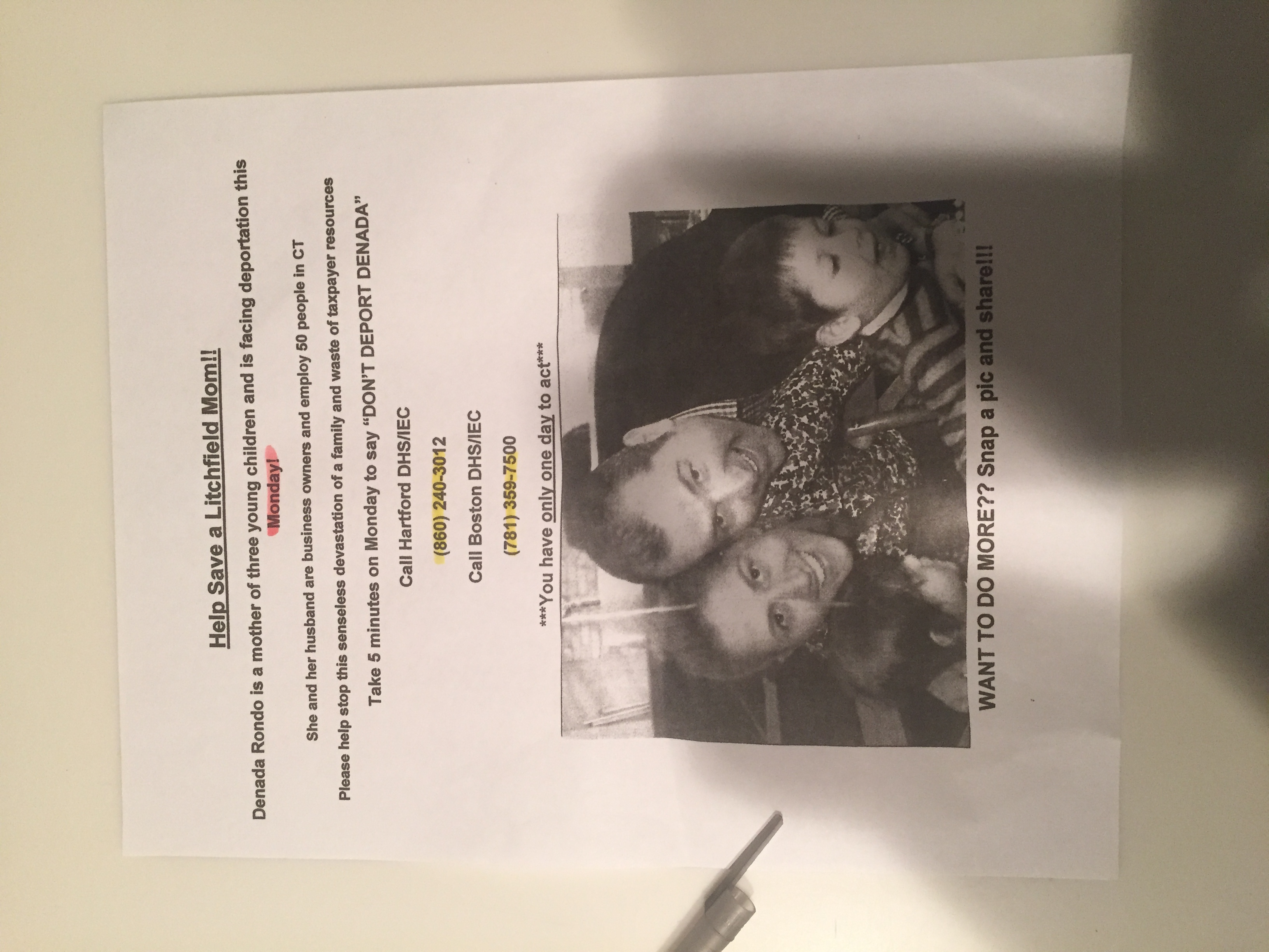 A terrible injustice is happening to a family I know. (see attached flyer). Denada Rondos is being deported to Albania tomorrow unless she can get a stay from the Federal Immigration court. Mrs. Rondo fled to America years ago to escape violence in Albania when she was 16 years old. Her parents sent her here. Together with her husband Viron, who got his American citizenship, they have built a successful restaurant in Cheshire where I live. They are lovely, hardworking, generous people and they have 3 young children- age 1, 5 and 8, all American citizens. Their business employs over 50 people. They are an immigrant success story and people we should all be proud to call our neighbors and fellow citizens.