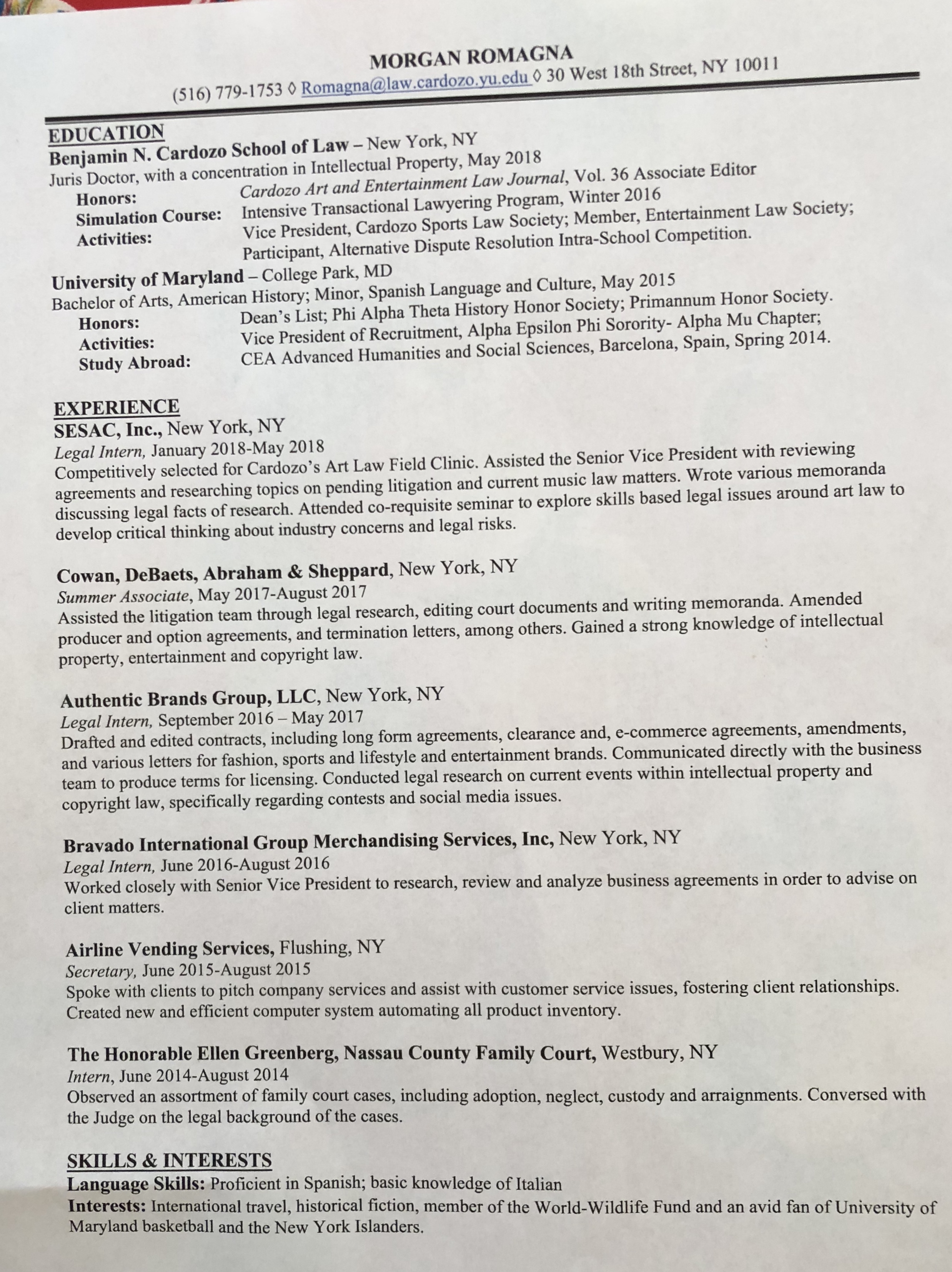 Below is the resume of Morgan Romagna who just passed the Bar. She graduated with a concentration in Intellectual Property law and was Associate Editor of the Cardozo art and entertainment law journal. She is proficient in Spanish.