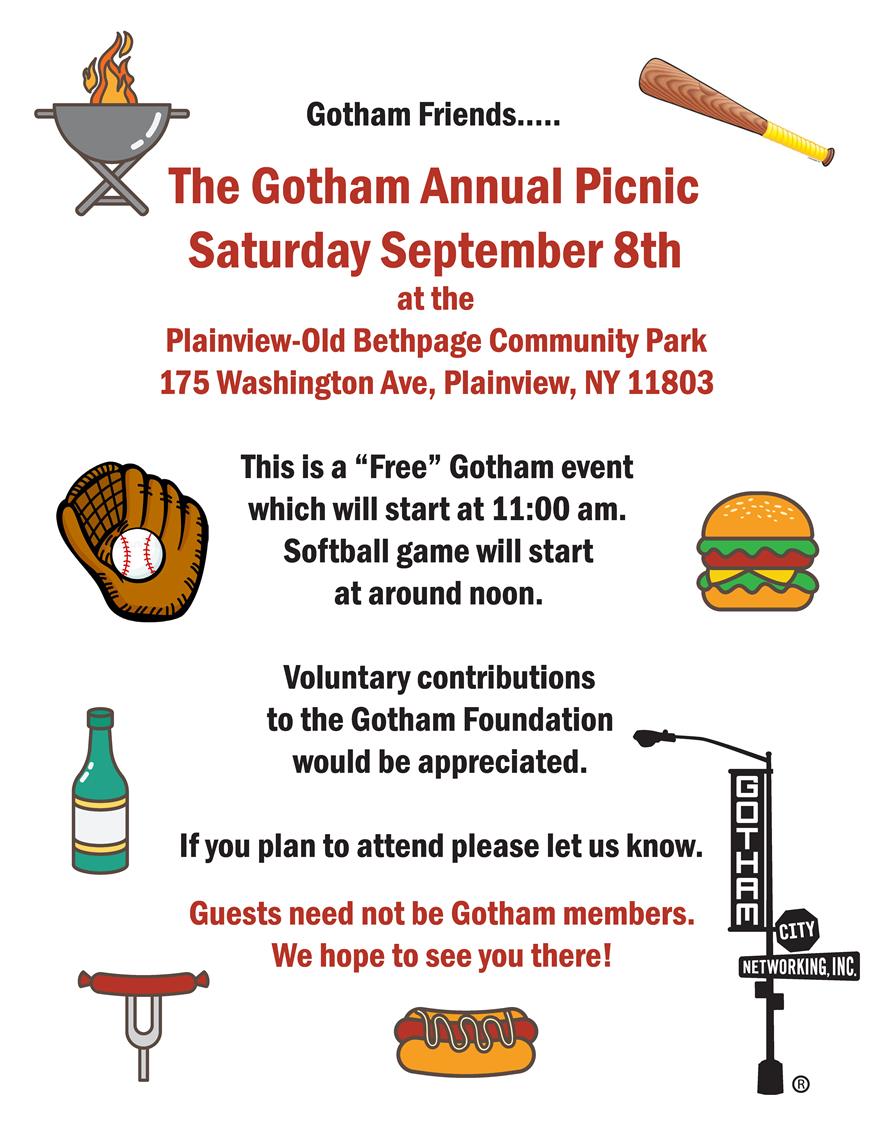 Bring your family, bring your friends, bring potential networkers, bring yourself…We are going to have a lot of fun at the Gotham Picnic and softball game this Saturday the 8th.