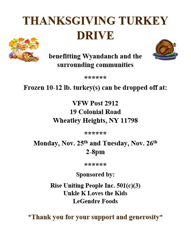 > It’s that time of the year again and so many are in need.  There will be a turkey drive Monday and Tuesday in Wheatley Heights. Please see flyer attached.  If you can donate a turkey but have no way of getting it there please let me know and we will try to arrange to get it from you.