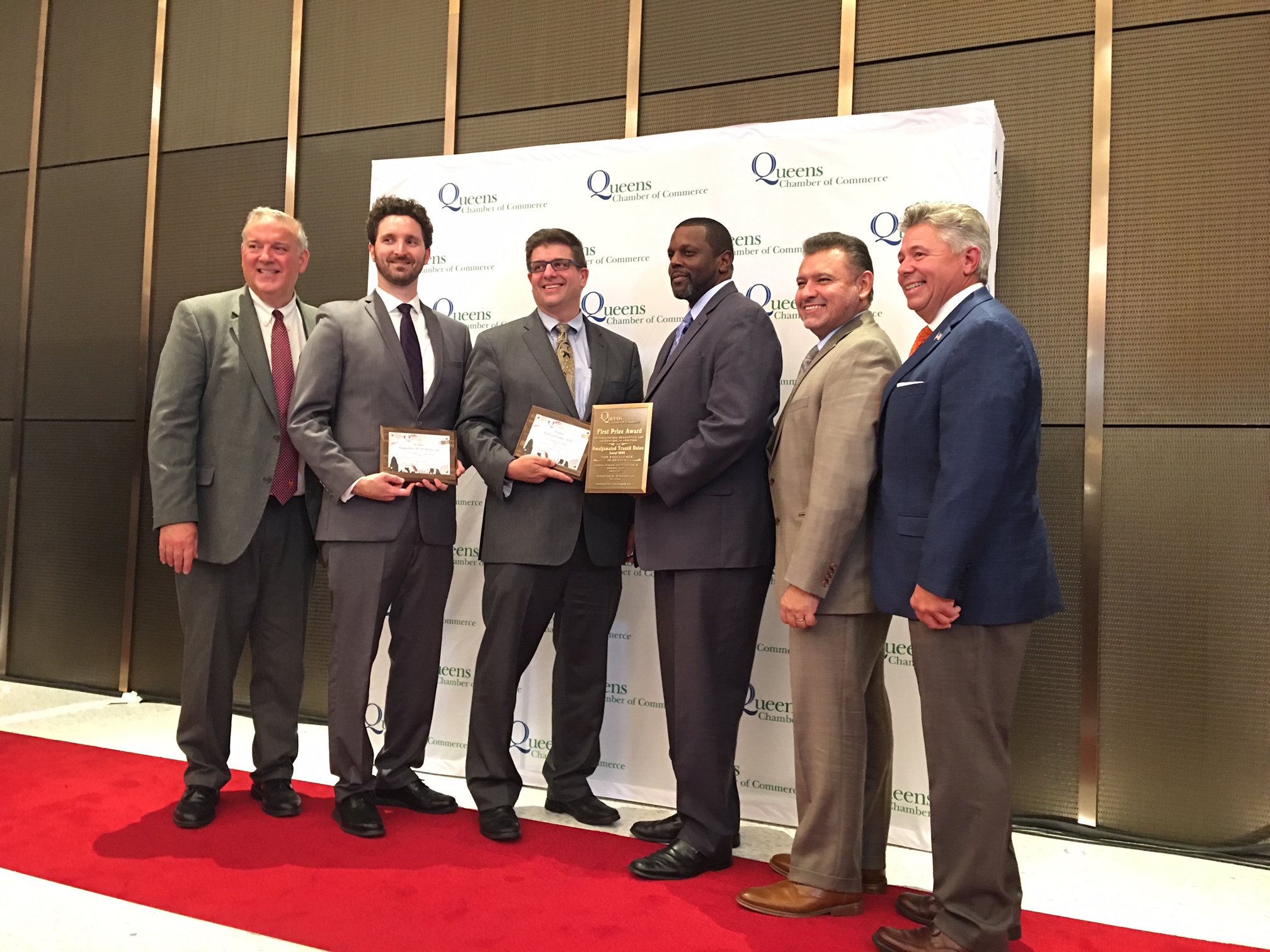 Below left to right Queens Chamber CEO Tom Grech, JZA’s Benjamin Grace, Joshua Zinder, ATU 1056 President/Business Agent Mark Henry and Vice President Luis Alzate, and Dominick D’Alonzo of Cowbay Contracting.