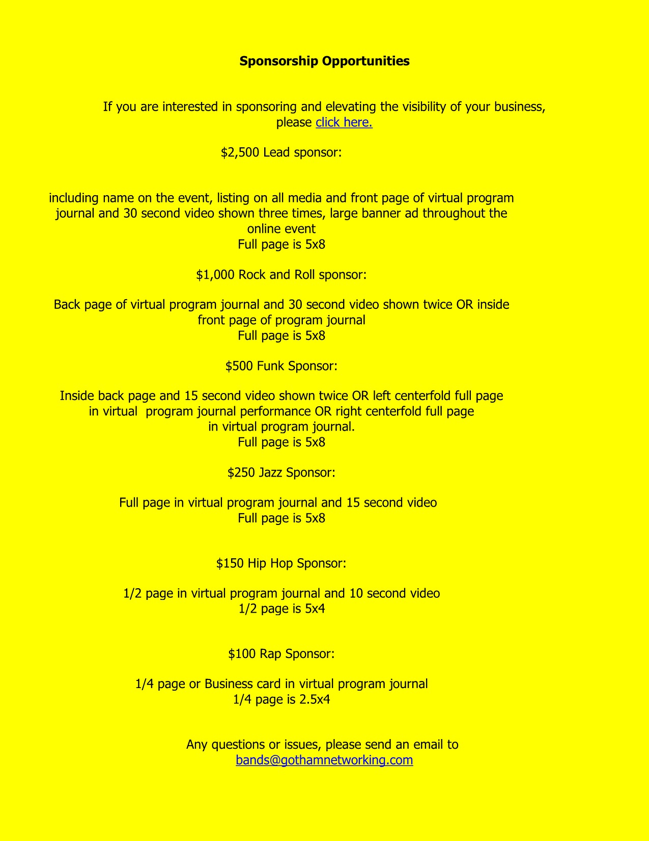 $500 Funk Sponsor: inside back page and fifteen (15) second video shown twice OR left centerfold full page in virtual program journal performance OR right centerfold full page in virtual program journal (Full page is 5x8”).