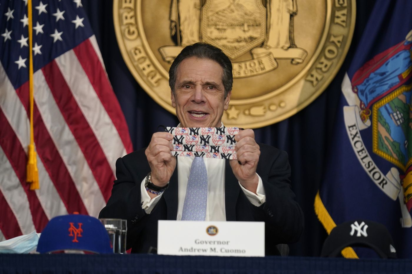 > FILE - New York Governor Andrew Cuomo shows off a mask that has both New York Yankees and New York Mets logos during an event at his office in New York, Thursday, March 18. (Seth Wenig)