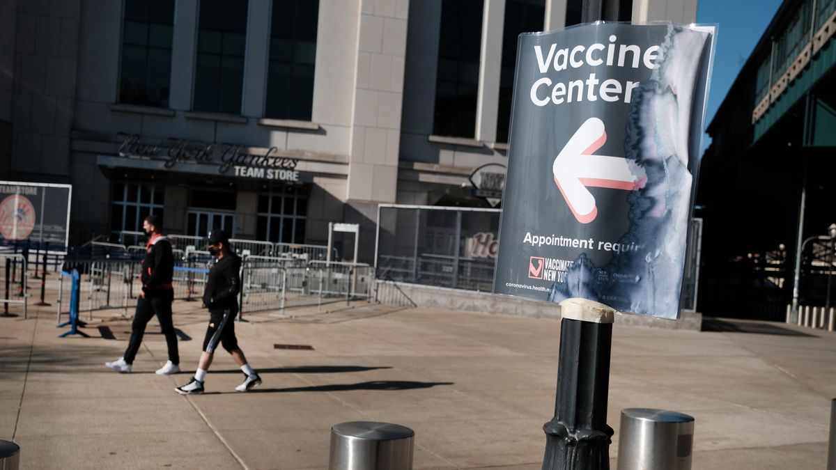 > FILE - Signs direct people to the Yankee Stadium Covid-19 vaccination site on March 30, in New York City. (Spencer Platt/Getty Images)