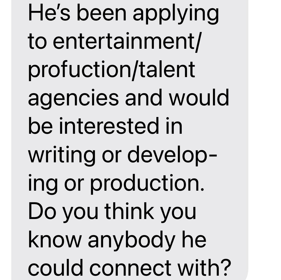 My granddaughter’s friend just graduated college and is looking to break in.  Please see below.  All leads are appreciated :)