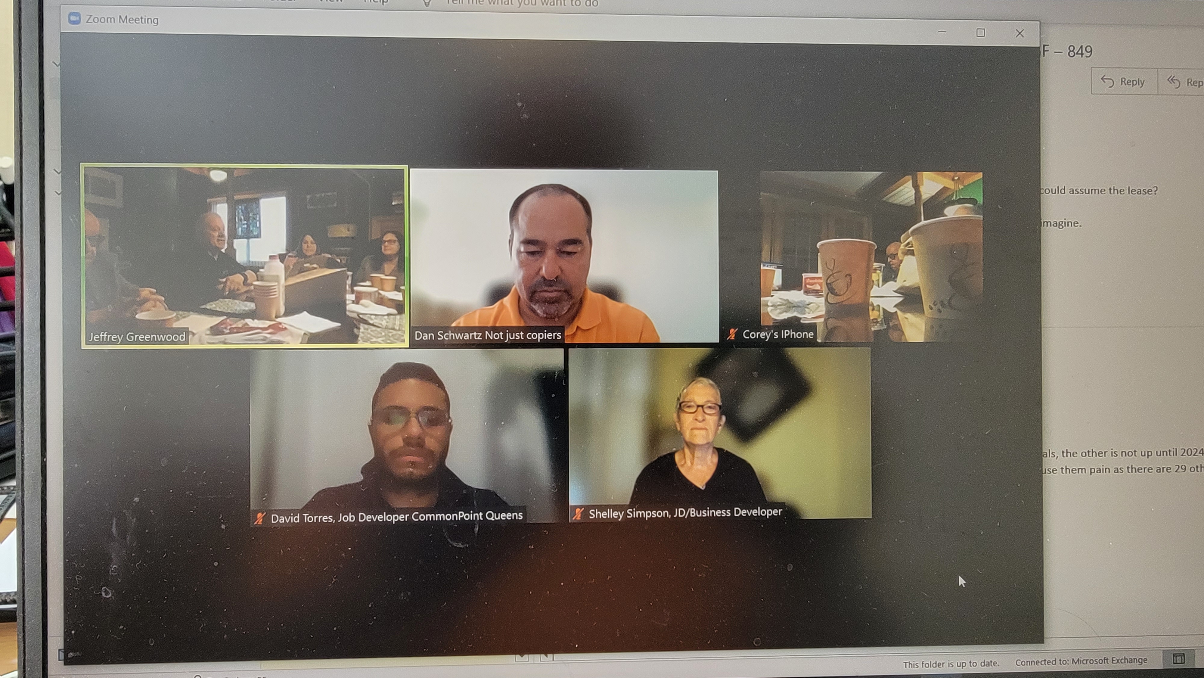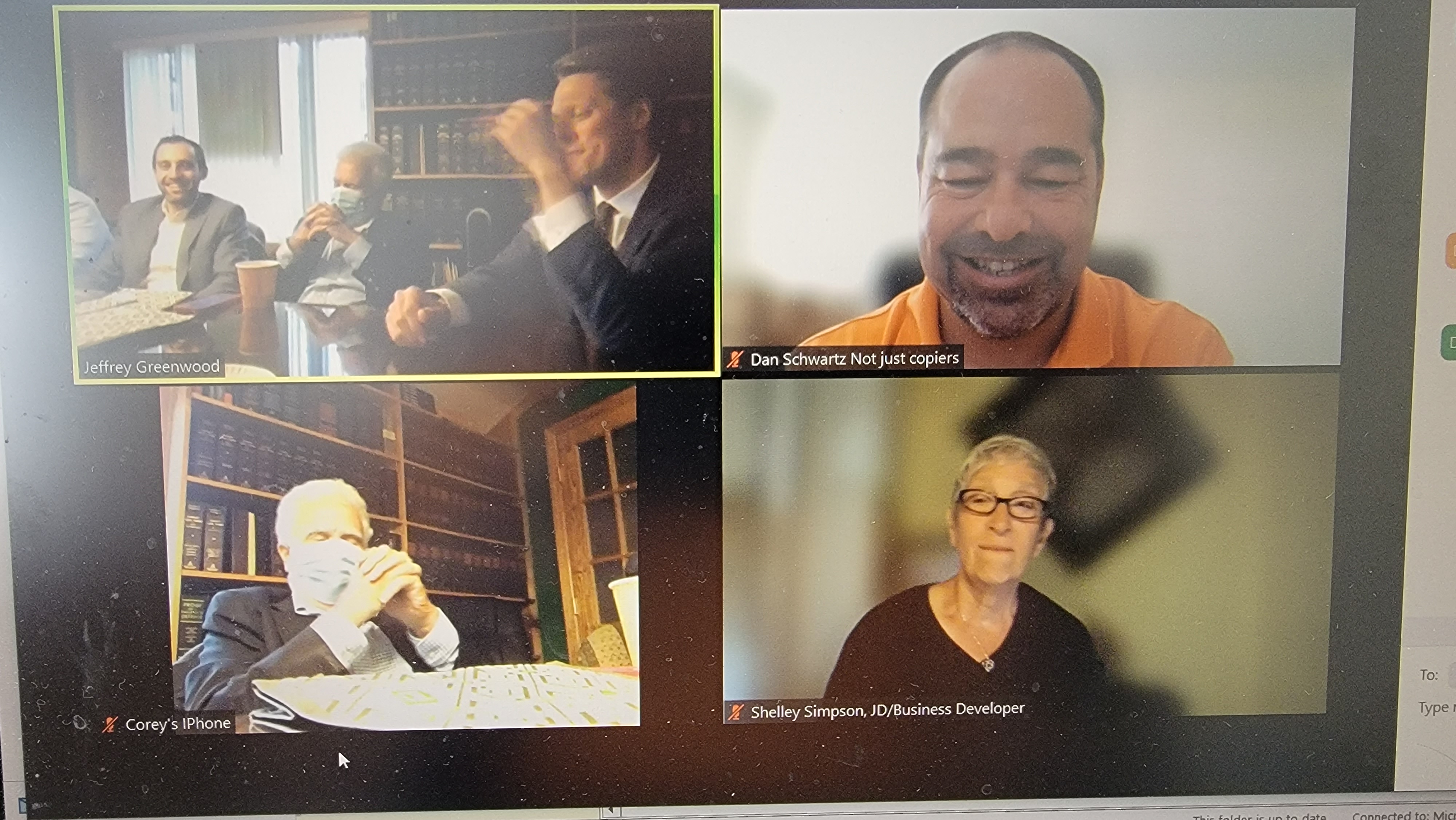 At 8:00 AM this morning, we had Gotham's first Hybrid meeting mixing a live breakfast meeting with a Zoom component. Thank you Jeff Greenwood from the Law Office of Ronald Schwartz (Estate planning, trusts, wills and hospice advice) who provided the conference room and laptop to allow those that could not make it in person be part of the happening. Thanks to Corey Bearak who also provided a 2nd camera via his cell phone which ensured all at the table were in view. He also provided bagels, cream cheese, coffee and fruit. Everyone got to go around the table and we ended with the Zoom participants (Shelley Simpson Juice Plus supplements, David Torres with Common Point Queens and myself). It was fun and engaging and it worked.