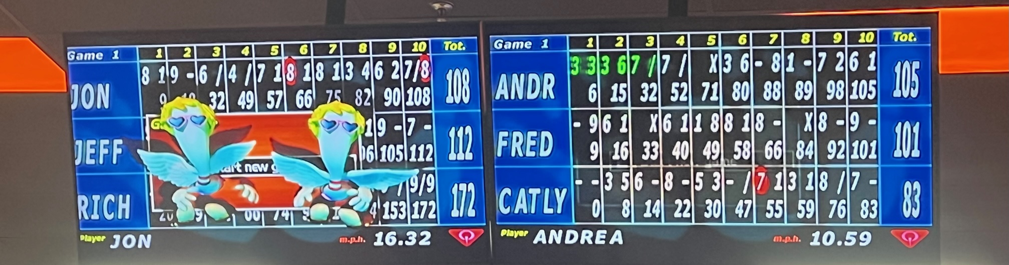 On team play Fred, Andrea and Caitlyn took down Rich, Jeff, and I with handicap.