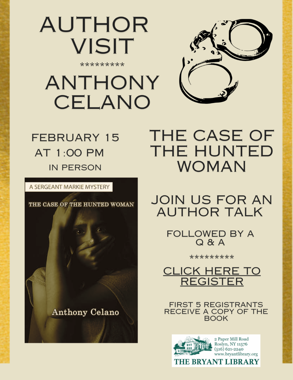 Anthony Celano will discuss his latest Sergeant Markie Mystery: The Case of the Hunted Woman.