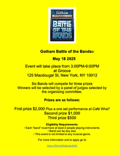 If you wish to apply a band, please go here <https://www.gothamnetworking.com/img/Battle2025.pdf> and scroll down to the application. Pay here <https://gothamnetworking.isecuresites.com/product/battleofthebands?_gl=1*15a18kw*_ga*NDY2Mjg0NjI5LjE3MjEyODU2MTI.*_ga_8J96G9K2KF*MTc0NDMxNTY0NS4yNDIuMS4xNzQ0MzE1OTk3LjUyLjAuMzM3OTEyNTYx> to apply.