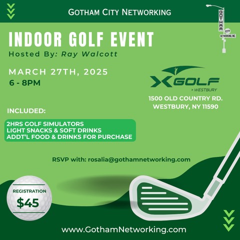Gotham City Networking invites you to an exciting Indoor Golf Event hosted by Ray Walcott <https://www.gothamnetworking.com/RayW> at X-Golf Westbury.