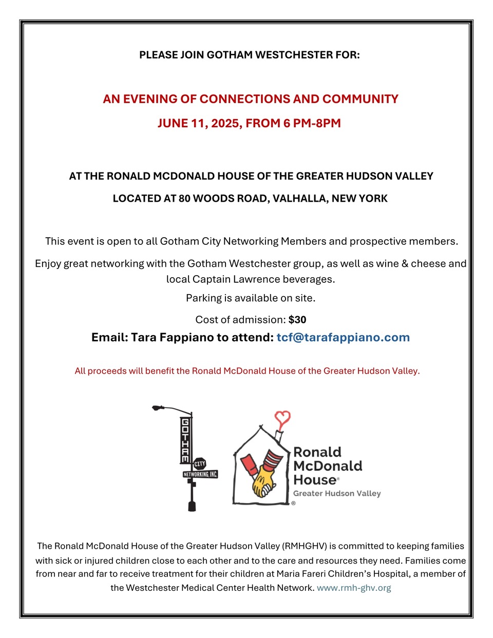 If you’d like to attend, email Tara Fappiano <https://www.gothamnetworking.com/Tara_Fappiano> at: tcf at tarafappiano.com <mailto:tcf at tarafappiano.com> or register HERE: https://gothamnetworking.isecuresites.com/group/Westchester/25191