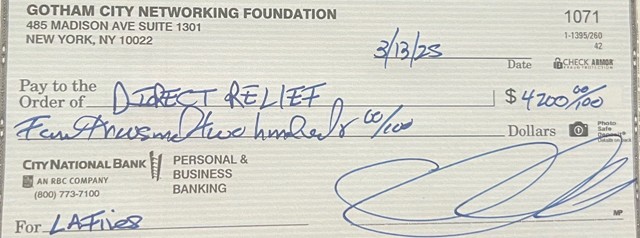 I am incredibly happy to report that a check has been sent from the Gotham Foundation to Direct Relief, in the amount of $4,200 - copy attached, below - for our recent fundraiser for those affected by the Southern California Wildfires.