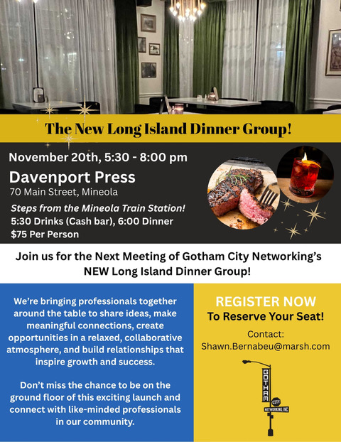 As we gear up for the next meeting of Gotham’s NEW Long Island Dinner Group on November 20th, we’re inviting circuit riders—and welcoming referrals for professionals who would be a great fit for this growing community.