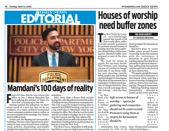 Another commentary was in mind but then my daughter, Marisa, texted an update from Friday when she shared the Daily News would publish her latest op-ed.  Late last night she reported today’s Sunday, (New York) Daily News would publish her Opinion Piece, “Houses of worship need buffer zones.”  The op-ed identifies her as “Bearak is assistant director of the American Jewish Committee regional office in New York.”  Not only did her learned piece run, in today’s print edition it occupies prime print space on the same page 26 (Please see image accompanying this commentary.) that readers will find today’s editorial.  Not bad.  It makes a parent proud; as did when a Member of Congress asked about Marisa on Friday during meetings at the New York City Central Labor Council.  Marisa’s work often has her interacting with many of the same folks in public office (or aspirants) I meet with in the course of my work.