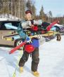 She thinks she has the better deal. Skis are awkward to carry, and it is even more tiring when you are wearing clunky ski boots and walking up a hill.